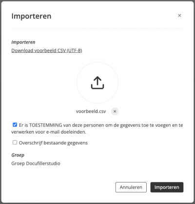 Wil je meerdere e-mailadressen aan de groep toevoegen, sleep de CSV (UTF-8) met e-mailadressen naar de cirkel. Of je klikt met de muis in de cirkel en selecteer je het juiste bestand op je computer. Vink vervolgens aan dat je toestemming hebt verkregen van de personen.