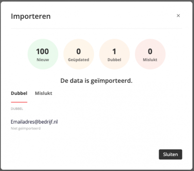 TIP controleer vooraf de juistheid van de te importeren e-mailadressen. Dubbele emailadressen worden slechts eenmaal geïmporteerd en e-mailadressen waarin bijvoorbeeld een spatie of andere niet toegestane tekens worden gebruikt, worden niet verwerkt. Dit kan een afwijking in het aantal e-mailadressen veroorzaken.